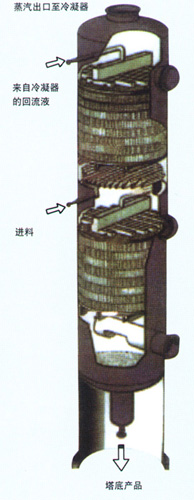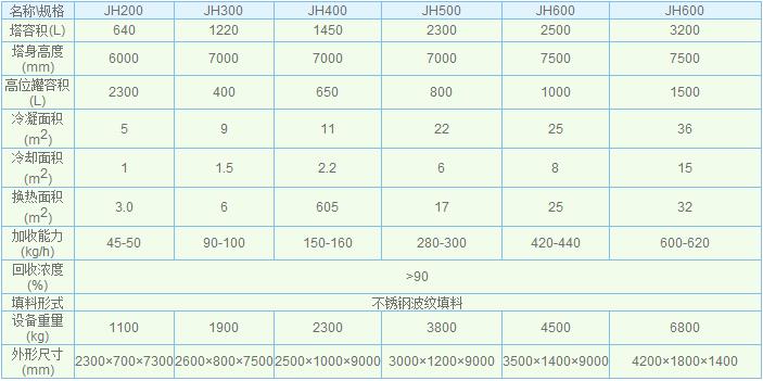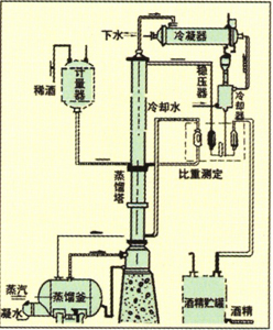 本装置采用高效的金属不锈钢填料。蒸馏塔采用不锈钢制,从而防止了铁屑堵填料的现象,延长了装置的使用期限。本装置中凡接触酒精设备部分如冷凝器、稳压罐、冷却蛇管等均采用不锈钢,以确保成品酒精不被污染。蒸馏釜采用可拆工U型加热管,在检修时可将U型加热管称出釜外,便于对加热管外壁及蒸馏釜壁进行清洗。本装置可间歇生产,也可半连续生产。